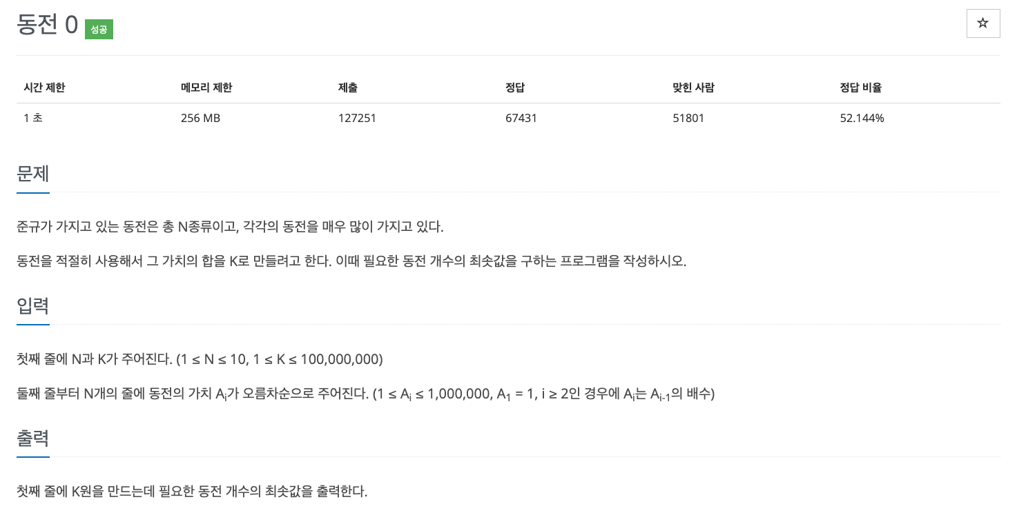 입력받은 동전의 종류를 크기순으로 정렬한 후, 나눌 수 있는 동전인 경우 나눈 값과 나머지 값을 이용하여 최솟값을 구해준다.