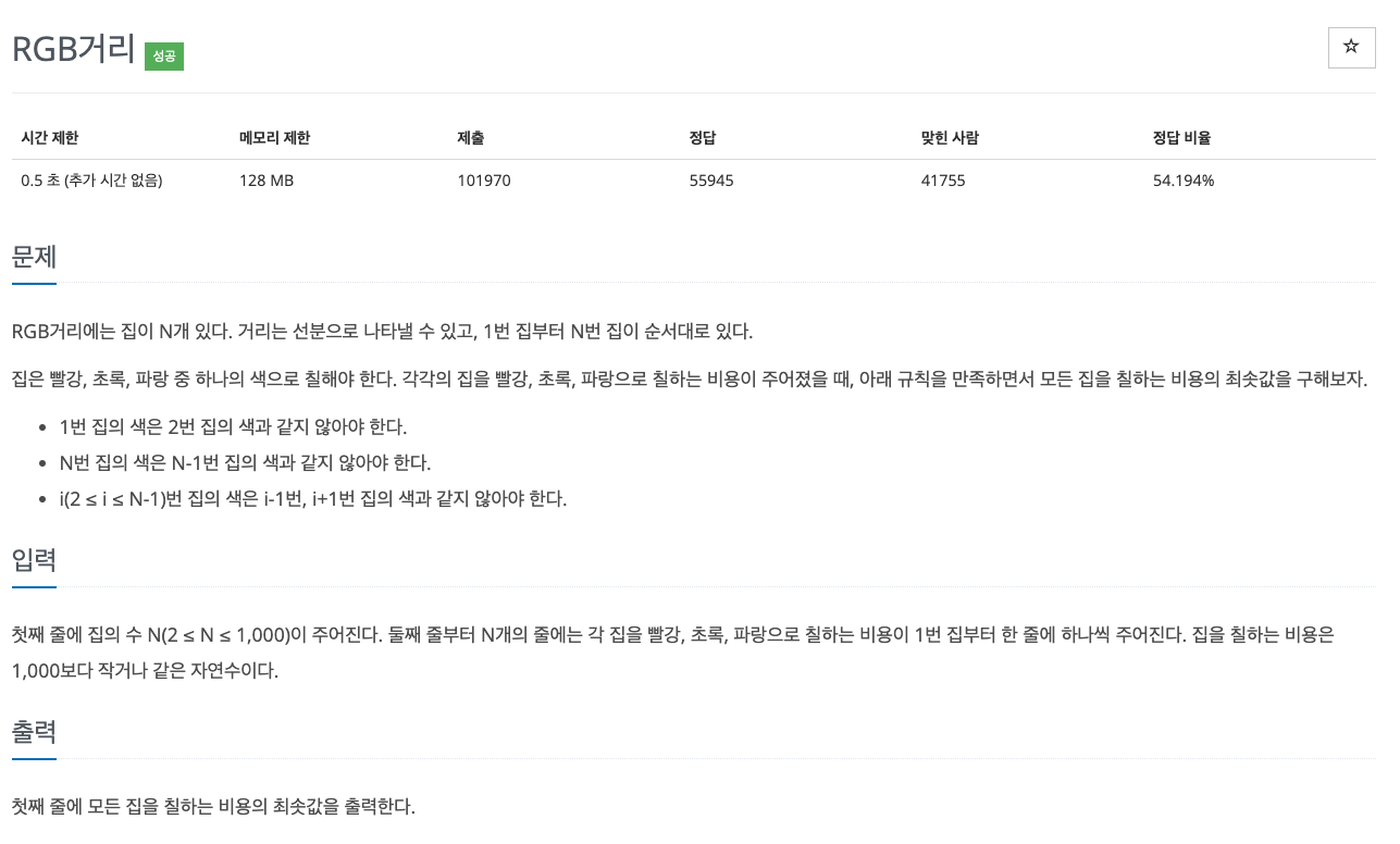 문제링크RGB거리에는 집이 N개 있다. 거리는 선분으로 나타낼 수 있고, 1번 집부터 N번 집이 순서대로 있다.집은 빨강, 초록, 파랑 중 하나의 색으로 칠해야 한다. 각각의 집을 빨강, 초록, 파랑으