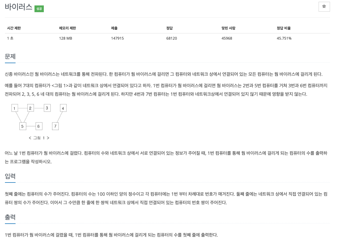 기본적인 dfs문제였지만 처음에 접했을 때는 바로 풀지 못했다. 다른 촌수계산 문제들을 풀다가 다시 돌아와 풀어보니 그래도 쉽게 풀렸던 문제. 연결되어 있는 컴퓨터들을 각 인덱스에 넣어주고 dfs로 탐색하면서 방문했던 노드는 제외하면서 카운트해주었다.