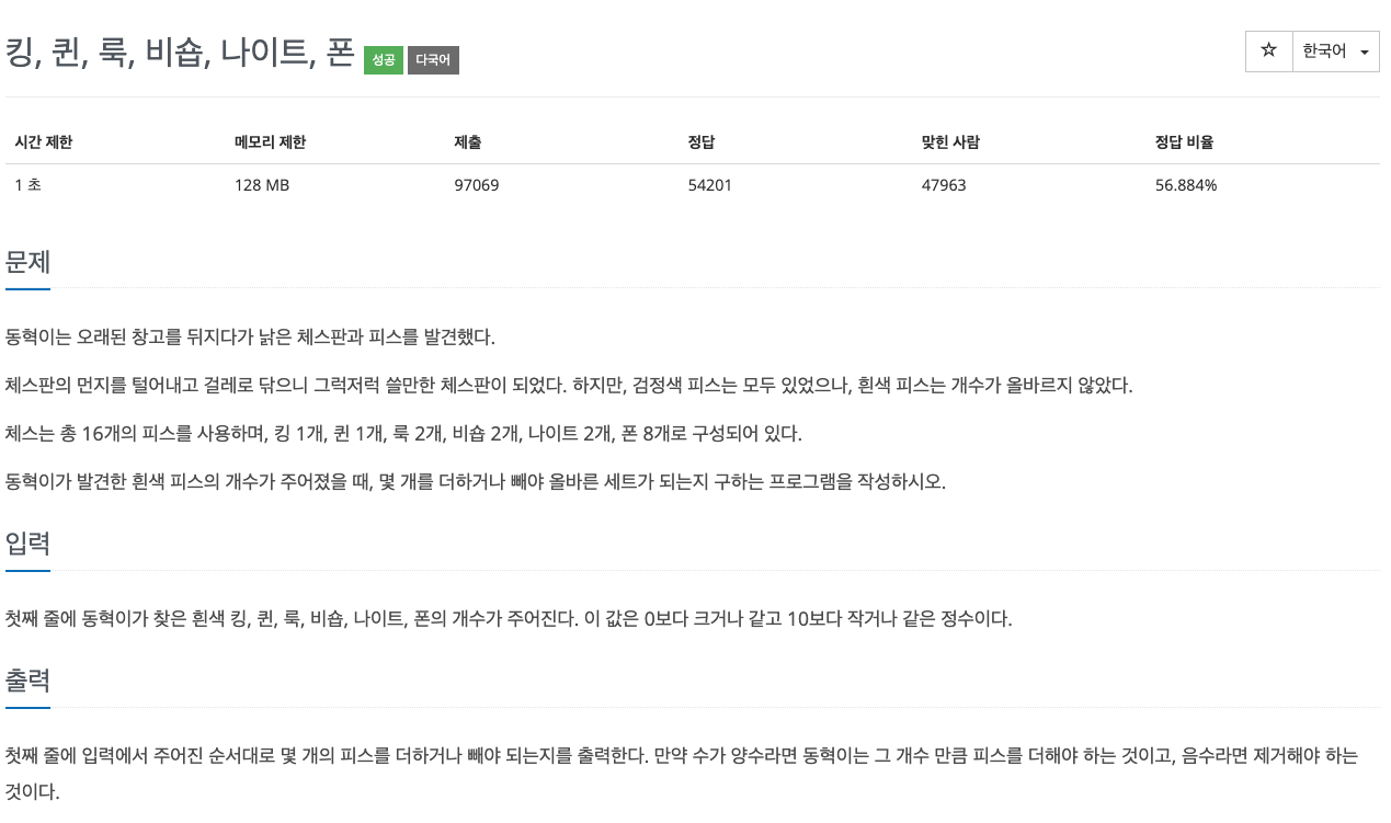 3003번: 킹, 퀸, 룩, 비숍, 나이트, 폰