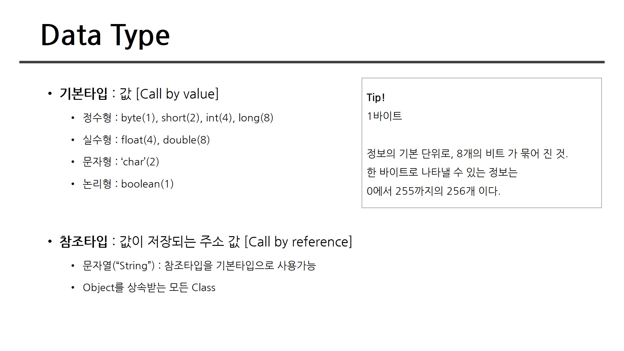 자바의 데이터 타입은 값을 호출하는 기본타입과, 값이 저장된 주소값을 호출하는 참조타입으로 나누어 진다.