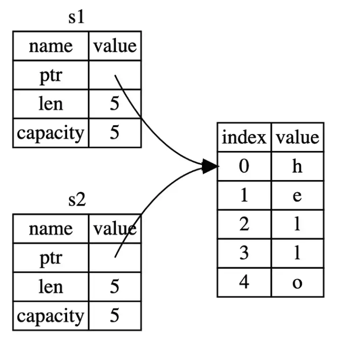 메모리 공간만 복사하는 위 과정은 shallow copy 와 비슷해 보이지만 Rust는 copy된 변수는 그 후로부터 무효화시키기 때문에 Rust에서는 이를 Shallow copy가 아닌 move라고 부른다. 위 예제에서는 “s1 이 s2 로 move됐다” 라고 표현한다. s1 = s2 코드가 실행된 이후 메모리 공간은 아래 그림 1–4와 같아진다.