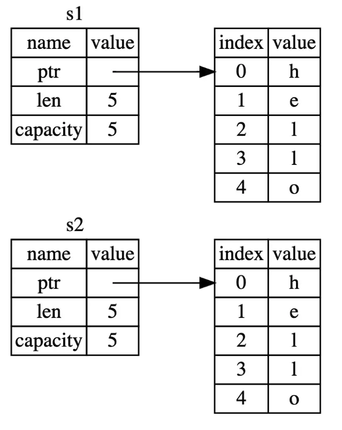 Rust는 이러한 잠정적인 에러를 막기 위해 다른 변수에게 메모리가 복사된 변수를 부르는 것을 허용하지 않는다. 이러한 이유로 s1으로부터 값을 불러오려는 println함수에서 에러가 발생하게 된 것이다.