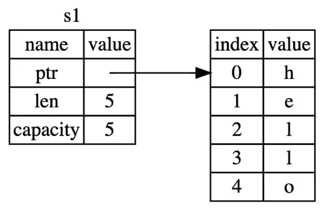왼쪽 테이블은 stack영역을 나타내며 오른쪽 테이블은 heap영역을 나타낸다. stack에서는 heap영역에서 해당 변수가 시작되는 메모리의 주소와 그 후로 얼만큼이 이 변수가 차지하는 공간인지를 나타내기 위해 len, capacity 값을 갖고 있다. 그리고 실제 데이터는 heap영역에 저장된다.