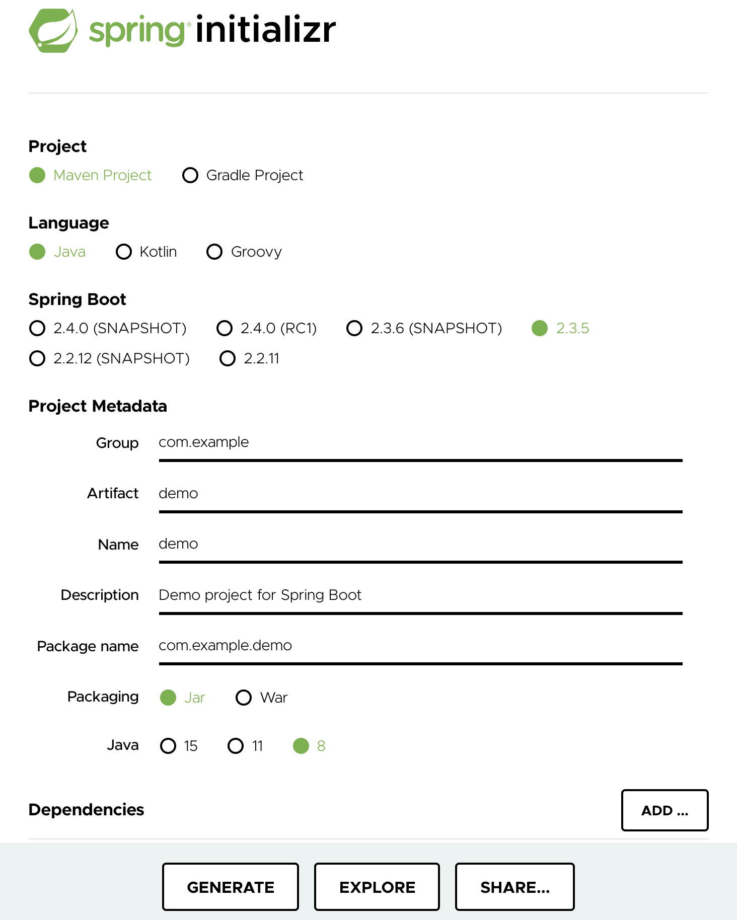 ▷ spring.io -> project -> spring initializr -> 원하는 설정 후 generate -> 압출해제 후 maven existing projects로 import